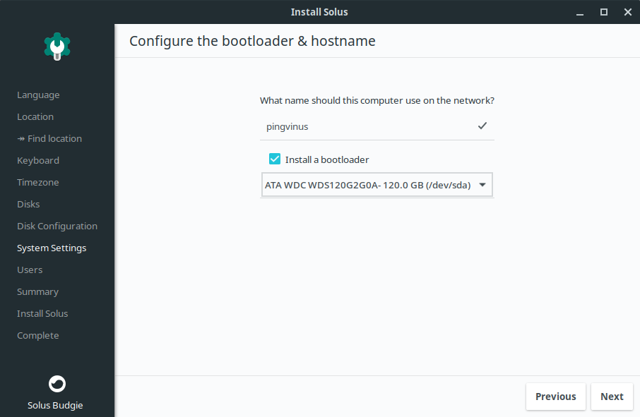 На этом же шаге нужно выбрать — устанавливать ли загрузчик (GRUB2). Установите галочку в поле Install a bootloader. В разворачивающемся списке выберите диск, на который производится установка системы. На этот диск будет установлен загрузчик GRUB. Я выбрал диск, на который я устанавливаю Solus.