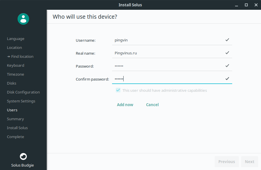 Введите данные о пользователе: имя пользователя (login), настоящее имя, пароль и повтор пароля. Нажмите кнопку Add now.