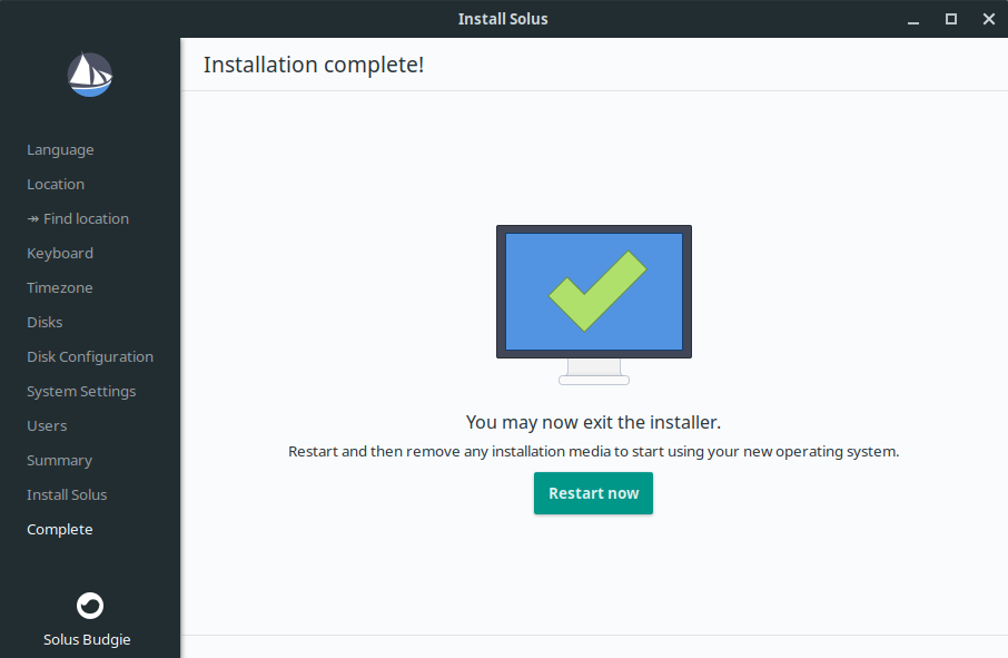 Когда установка завершится, отобразится соответствующее сообщение. Теперь можно перезагрузить компьютер и протестировать свежеустановленную систему. Для перезагрузки компьютера нажмите кнопку Restart now.