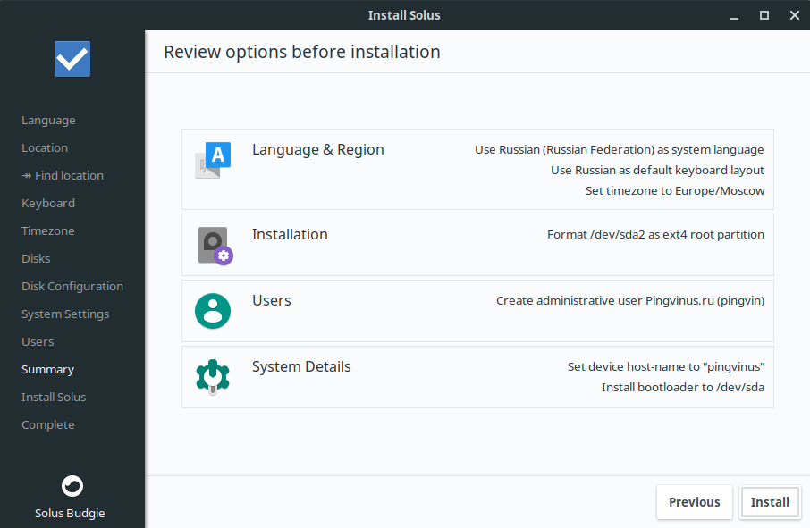 Отобразится информация со всеми параметрами установки Solus, которые будут использоваться. Внимательно проверьте, все ли указано верно. Если нет, то вернитесь на предыдущие шаги (кнопка Previous) и измените настройки. Если все указано верно, то нажмите кнопку Install.