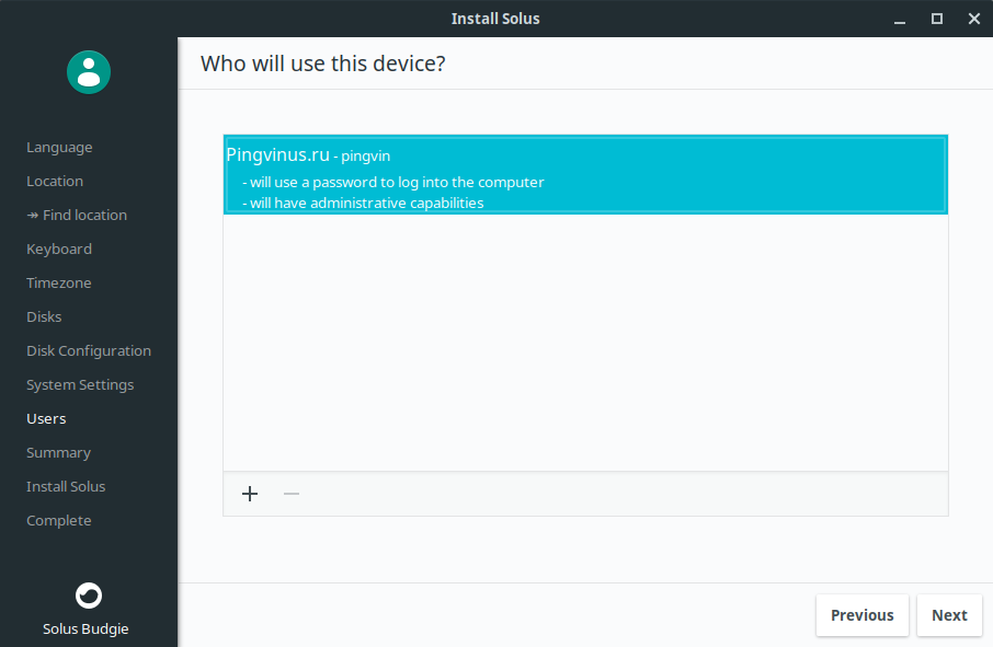 Отобразится окно, в котором представлен список пользователей, которые будут созданы во время установки системы. Вы можете использовать кнопки + или -, чтобы добавить нового пользователя или удалить существующего.