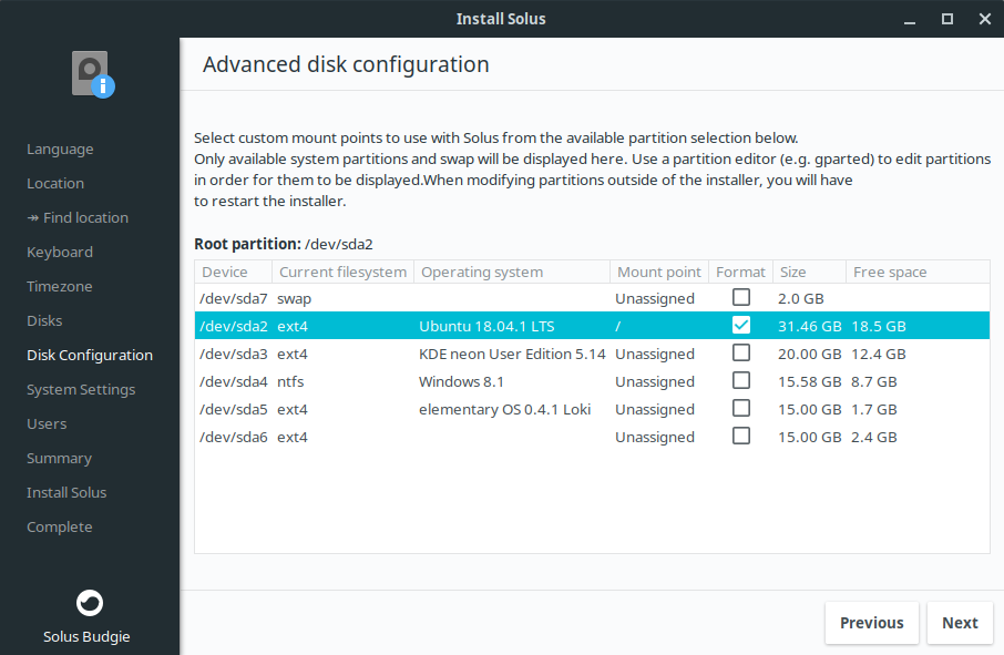 - Automatically partition this empty disk and install a fresh copy of Solus — автоматически разметить пустой диск и установить на него Solus. Выберите данный пункт, если вы устанавливаете Solus на пустой диск.