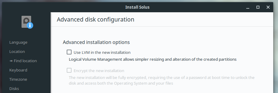 Если вы выбрали автоматическую установку Solus на целый диск, то появится окно с предложением создать LVM. Если вы не знаете, что это такое, то галочку ставить не нужно.
