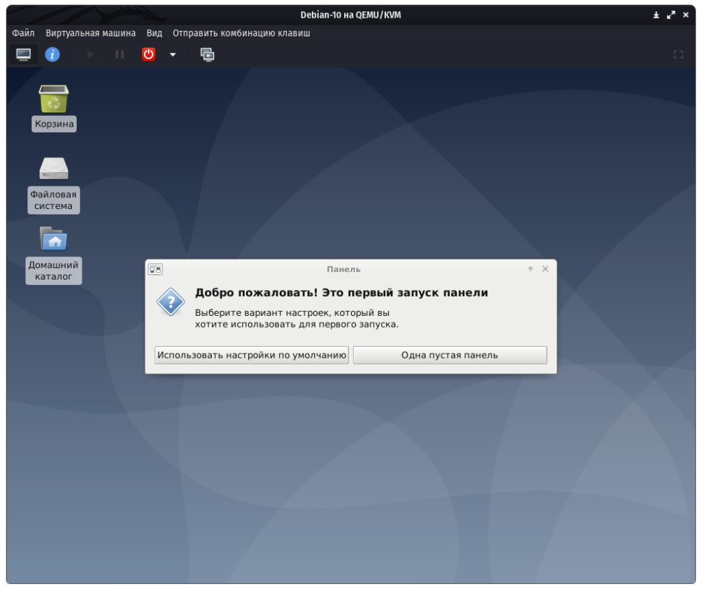 При первом запуске в дистрибутиве Debian появляется диалоговое окно, где пользователю предоставляется выбор панели, выбираем пункт “Использовать настройки по умолчанию”. Так как в большинстве случаев, хоть одна панель уже присутствует в других дистрибутивах, а прочитав данную инструкцию, в будущем вы и сами сможете создавать панели, сколько захотите:
