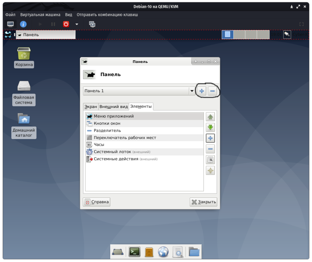 После нажатия кнопки “OK” панель изменит свой цвет, двигаемся дальше. А дальше самое интересное, это пункт “Элементы”, щелкнув на синий крестик откроется список элементов, которые можно добавить на панель. Стоит отметить, что возможно в данном списке будут присутствовать не все элементы и для их установки необходим пакет xfce4-goodies. Про эти элементы поговорим чуть ниже, а сейчас вернемся к панели, что бы создать или удалить панель, в самом вверху имеются крестик и минус: