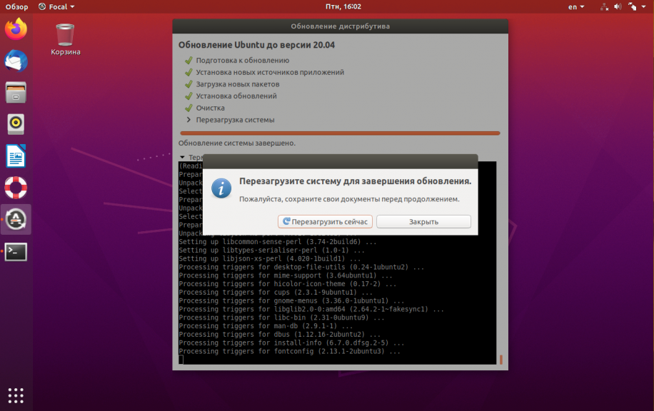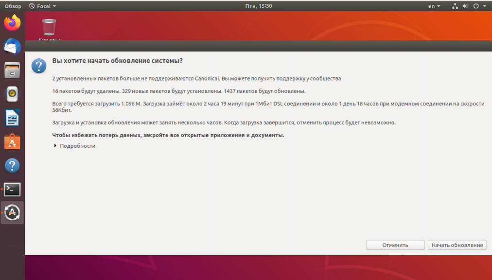 Утилита сообщит, что обнаружен новый выпуск Ubuntu 20.04. Для начала процесса обновления нажмите Обновить.