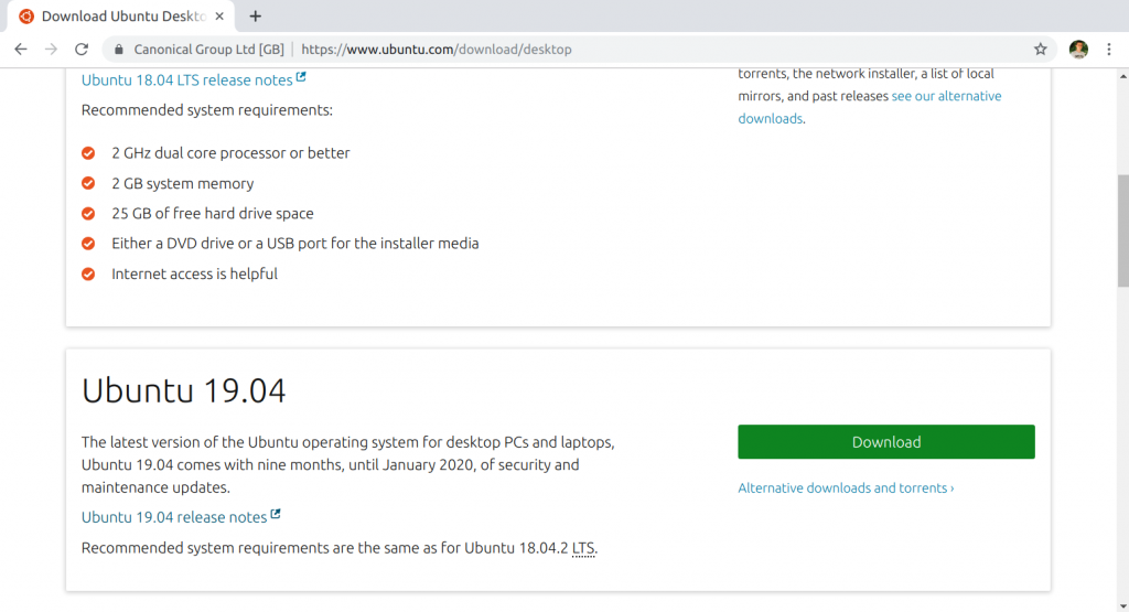 Загрузка начнется автоматически, после того, как вы нажмете кнопку Download. На странице загрузки доступно два образа Ubuntu 18.04.2 и 19.04. Так, как мы хотим самую свежую версию, то нам нужен образ 19.04.