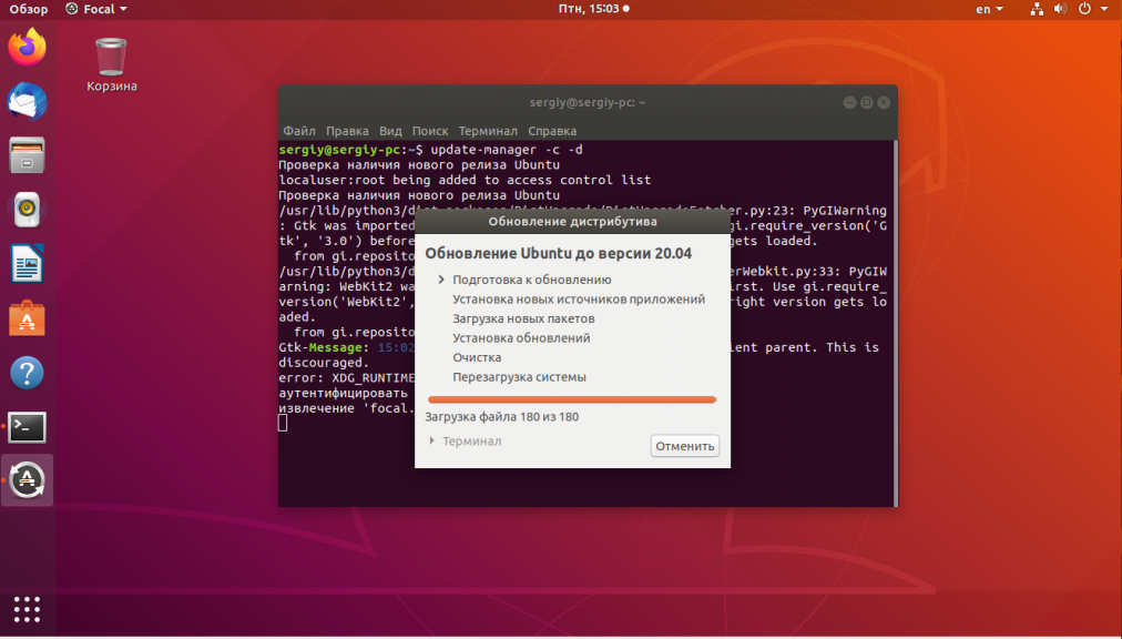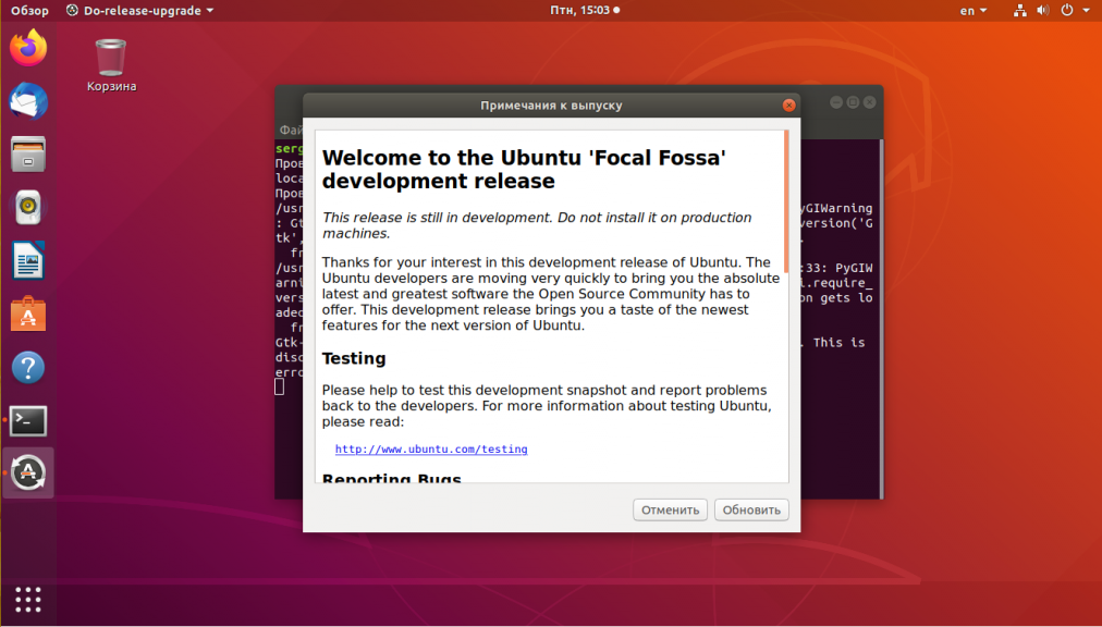 Первым делом необходимо обновить вашу текущую версию дистрибутива до самой свежей версии из репозиториев. Это необходимо, чтобы утилита обновления работала в максимально приближенных условиях к тем, в которых её создавали, и вы не получили никаких ошибок или проблем. Это можно сделать через терминал: