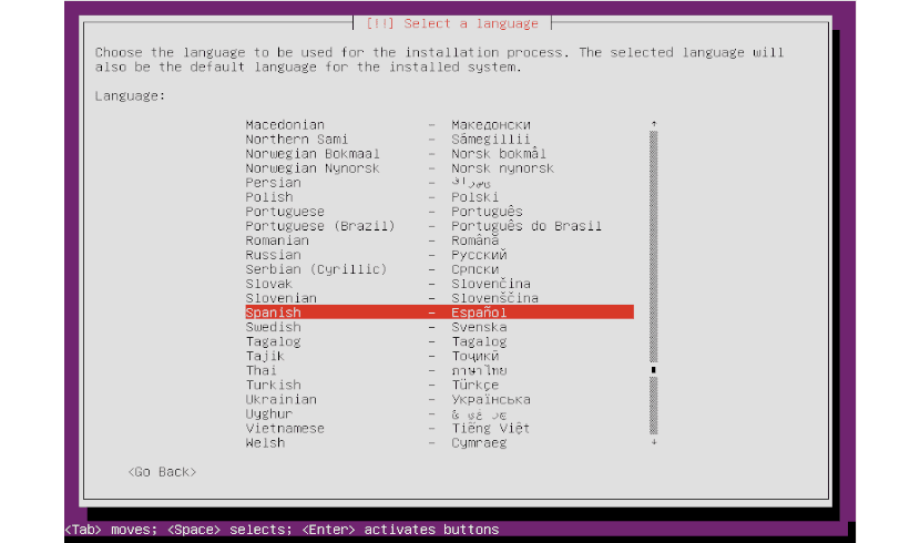 Мы будем использовать клавишу TAB или стрелки направления для навигации по установщику. и клавишу пробела, если вам нужно выделить / отметить поля.