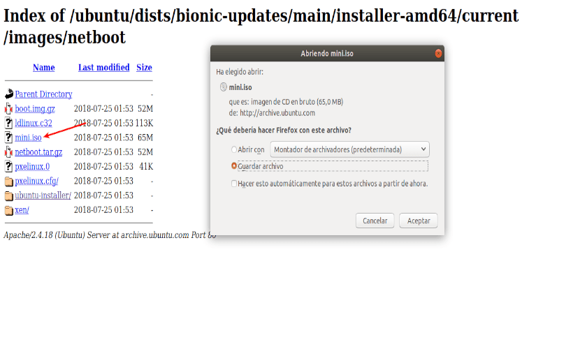 Начнем с того, Мы загрузим загрузочный образ Ubuntu 18.04 LTS Netboot.. Нам нужно загрузить файл Ubuntu mini.iso для архитектуры, которую нам нужно использовать, из здесь (65 МБ для AMD64).