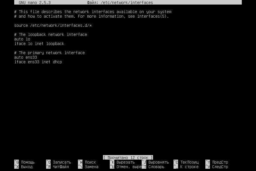 Рис.6 — Файл конфигурации /etc/network/interfaces для получения настроек сети по DHCP.