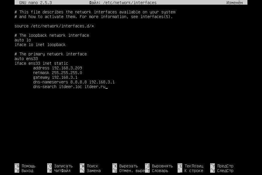 auto ens33 iface ens33 inet static address 192.168.3.209 netmask 255.255.255.0 gateway 192.168.3.1 dns-nameservers 8.8.8.8 192.168.3.1 dns-search itdeer.loc itdeer.ru