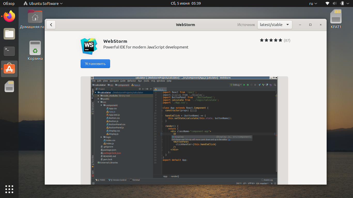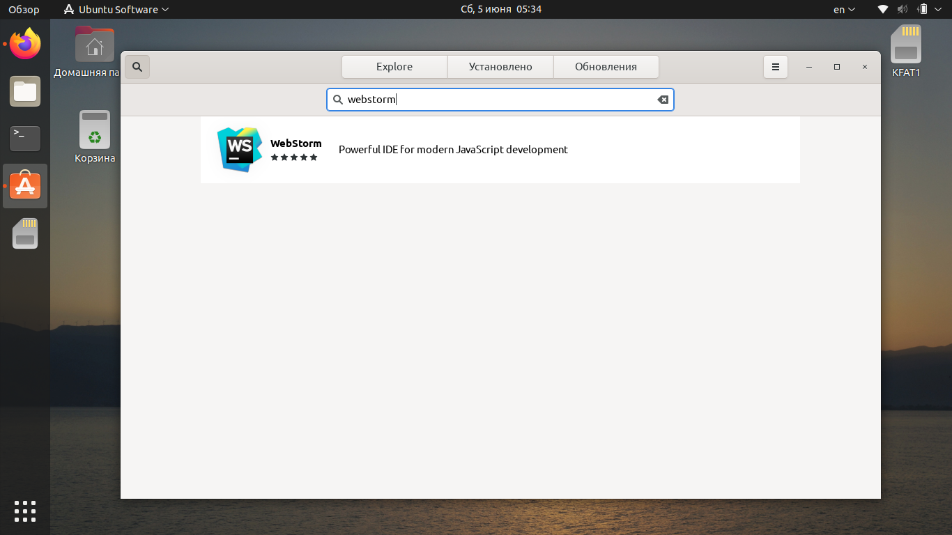 Самый простой способ установить программу — запустить центр приложений Ubuntu и в поиске ввести WebStorm.