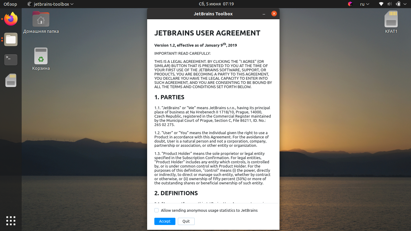 Сразу после запуска на экране появится запрос об отправке анонимных данных в JetBrains. Вы можете согласиться или отказаться.