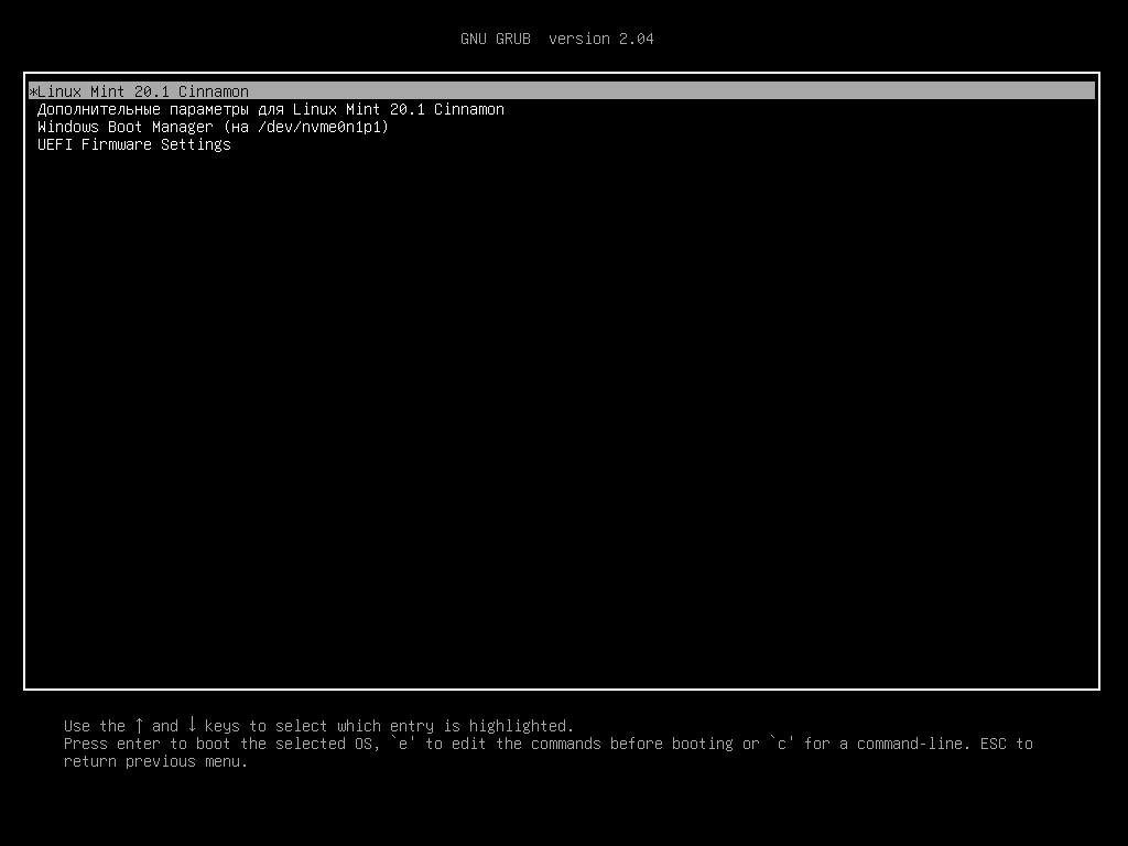 Если вы всё сделали правильно, то должны будете увидеть стартовое окно загрузчика GRUB, где сможете выбрать систему для запуска — Linux Mint 20.1 Cinnamon или Windows Boot Manager (загрузчик Windows 10):
