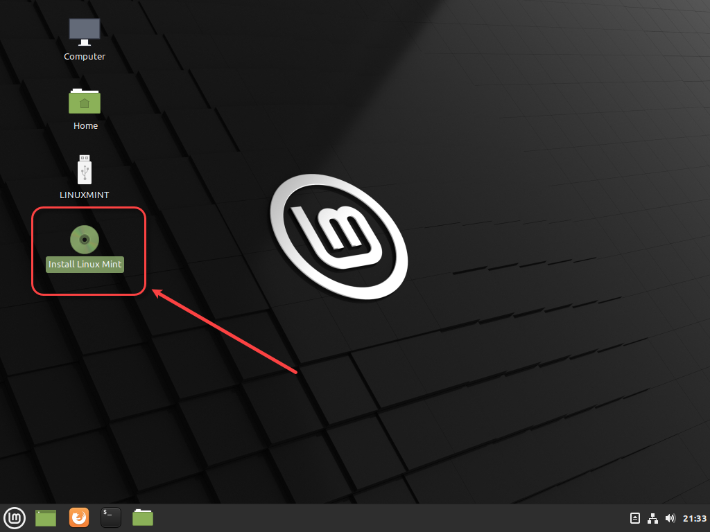 После того, как Linux Mint загрузится, найдите на рабочем столе иконку с надписью и щелкните по ней: