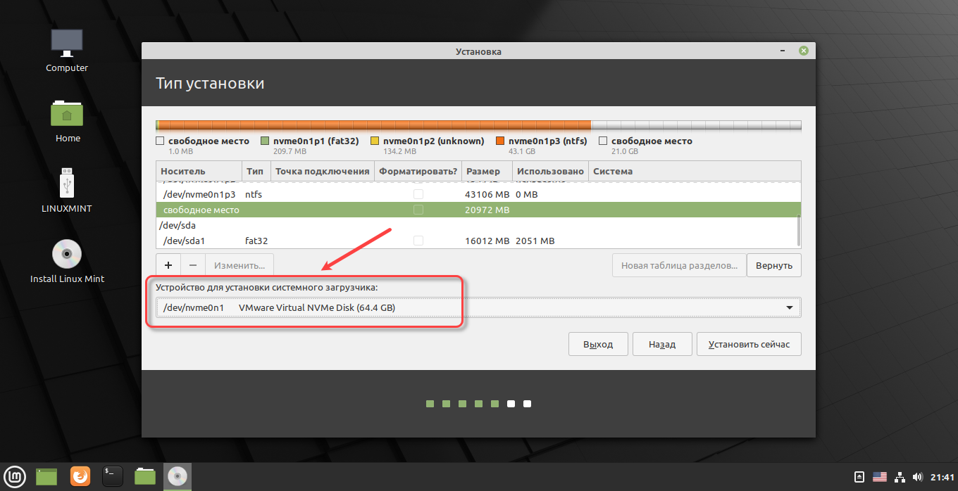 Примечание: На вышеприведенном скриншоте также можно заметить устройство dev/sda — это USB-накопитель, с которого в данный момент происходит установка Linux Mint.