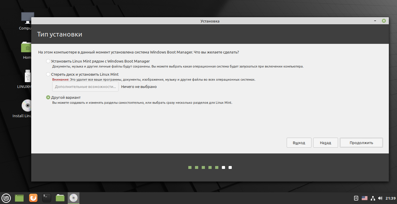 Так как мы хотим сделать возможной загрузку с одного диска как Windows 10, так и Linux Mint, то выбираем пункт :