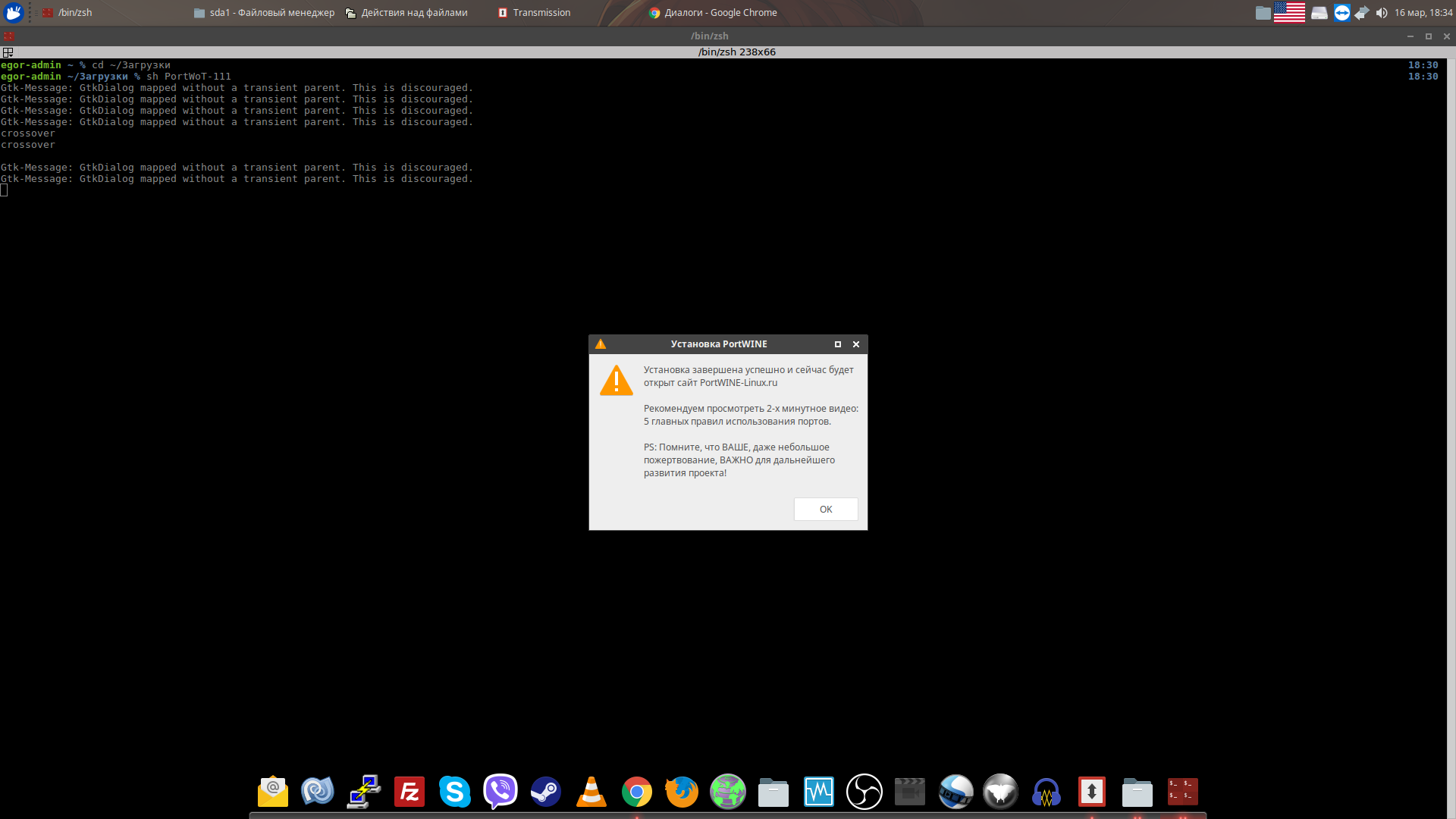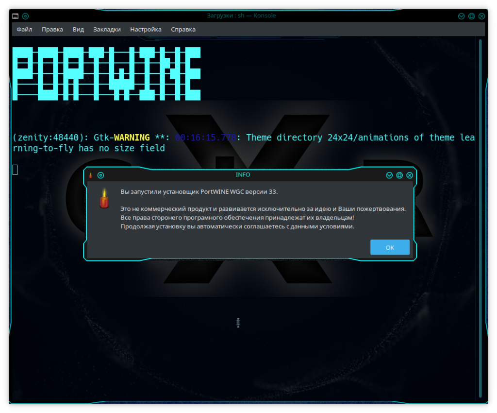 Напоследок я хотел бы сказать спасибо автору проекта portwine за его проделанную работу. Все таки это значимый вклад в развитие игрового процесса в Linux, а так же проделана колоссальная работа облегчающая установку игр. Если же вы посмотрите весь процесс создания данных скриптов, то вы поймете о чем идет речь. Для этого достаточно перейти на канал в youtube и посмотреть как автор пишет установочные скрипты. А так же решает возникшие проблемы. И все это только для того, что бы мы смогли без особых проблем запускать наши любимые игры и наслаждаться игровым процессом.
