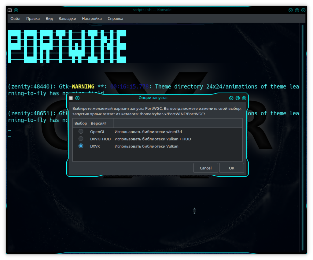 После чего запуститься процесс установки Wine и соответственно Wargaming. Вовремя установки вам нужно будет выбрать с помощью чего вы планируете запускать игры “DXVK” или “OpenGl”. Пункт “DXVK+HUB” просто выводит информацию о FPS и загруженности системы. Я же рекомендую запускать при помощи “DXVK”: