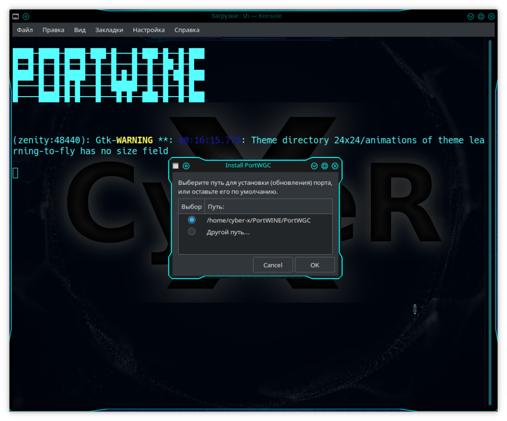 Здесь вам необходимо путь для установки. Я буду использовать стандартный, при этом в вашей домашней папке создаётся подкаталог PortWINE, в который и будут устанавливаться игры. Но вы можете указать свой путь для установки: