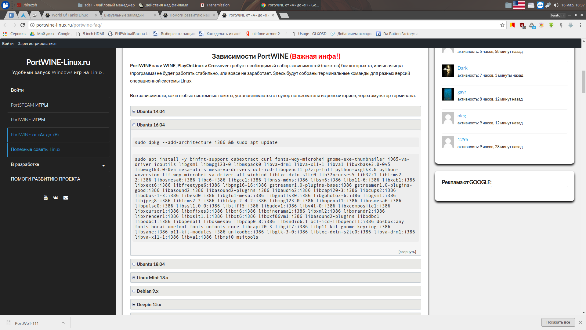 Пока установщик качается, вам необходимо установить зависимости. Вы, конечно можете и не делать этого, но в этом случае игра может вообще не запустится. На сайте указаны команды для установки зависимостей под самые разные дистрибутивы GNU/Linux. Найти инструкции по установке можно в разделе “PortWINE от «А» до «Я»”. Так как я использую Xubuntu 16.04, то и буду использовать зависимости для 16-ой *buntu: