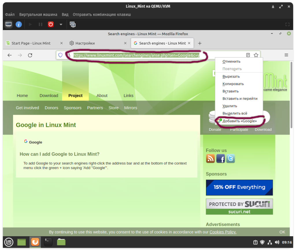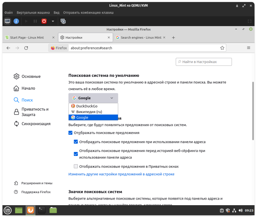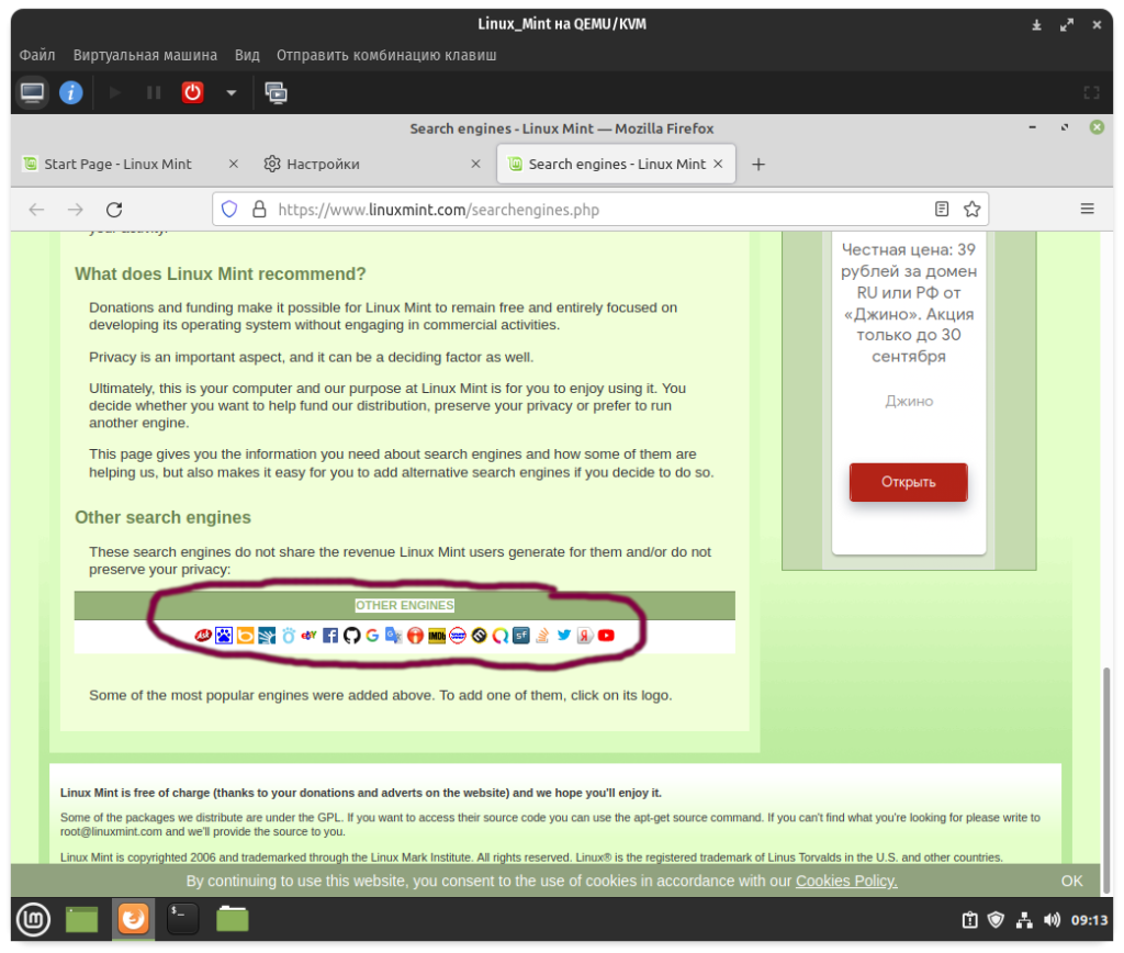 Нажимаем на эту надпись и попадаем на страницу сайта Linux Mint, тут нам опять же нужно спуститься в самый низ страницы до надписи “Other engines”. Под этой надписью ищем нужную нам поисковую систему: