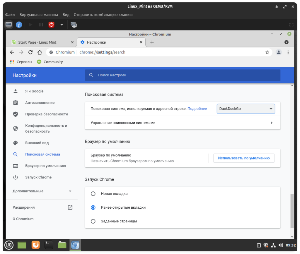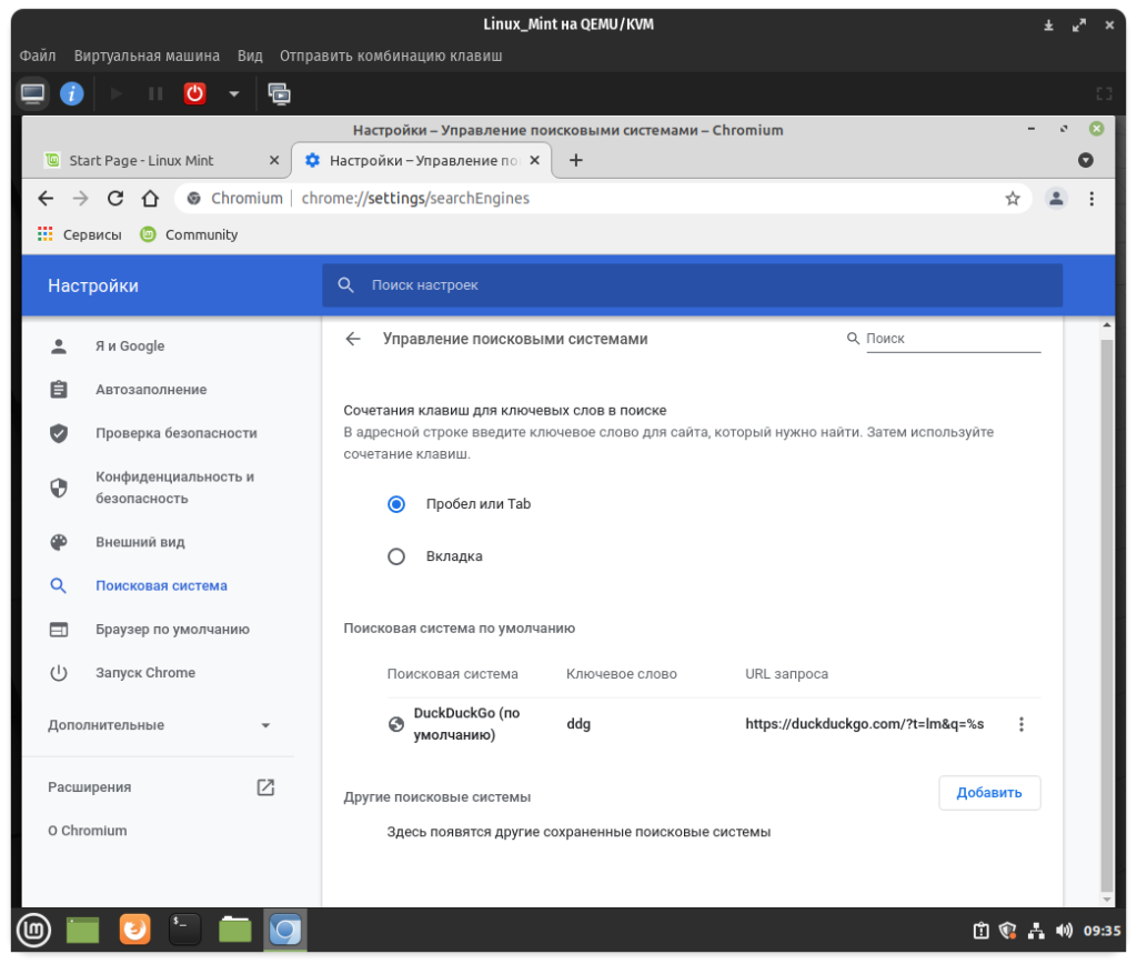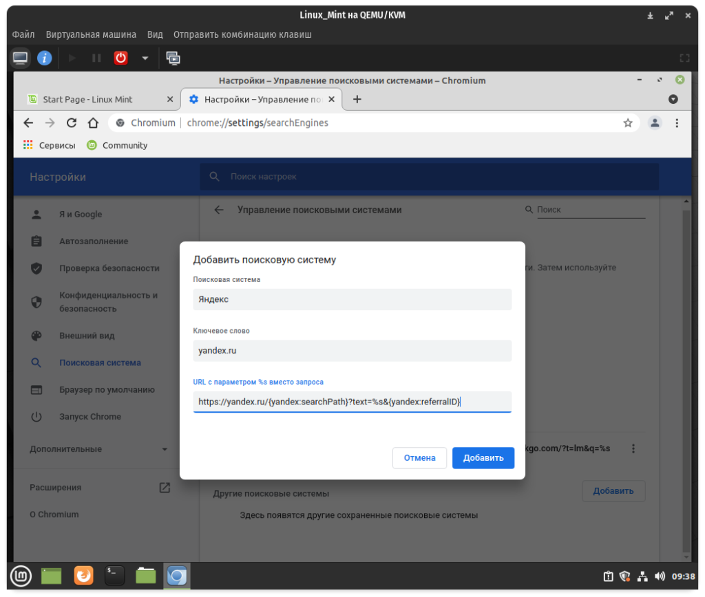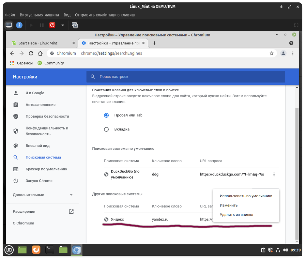 Что касается поисковика от Google в браузере Chromium, вы его можете вернуть в Linux Mint прочитав эту статью. Повторятся не будем, а переходим к добавлению поисковика от Yandex. В браузере Chromium переходим в настройки и переходим в пункт “Поисковая система”. Тут собственно все по аналогии с предыдущей статьей, где мы добавляли поисковик от Google. Нажимаем на “Управление поисковыми системами”: