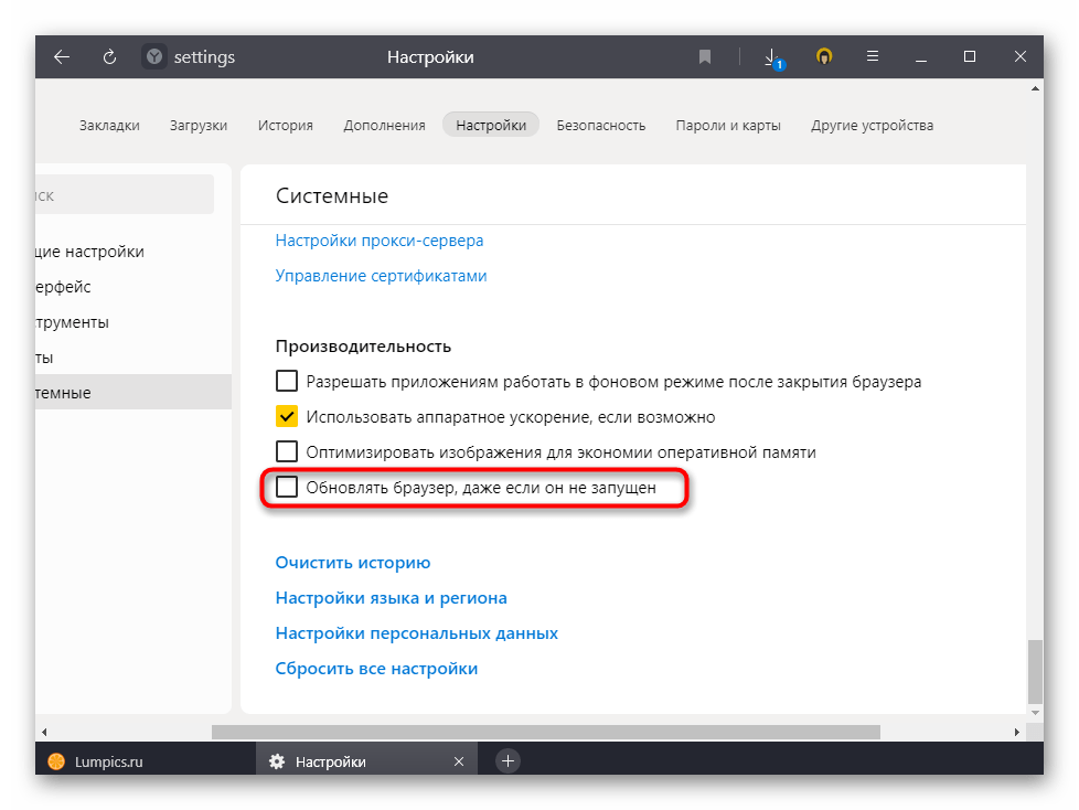 Когда тормоза наблюдаются лишь периодически, повода для беспокойств может и не быть — современные браузеры обновляются постоянно, и иногда это занимает непривычно много времени. Узнать, так ли это, несложно через его настройки. Откройте их и поищите пункт «Обновлять браузер, даже если он не запущен» или «Использовать фоновую службу для установки обновлений». При отсутствии там галочки легко сделать вывод, что ему действительно приходится обновляться только при запуске, из-за чего и возникают задержки. Установите эту галочку, если хотите, чтобы тот скачивал апдейты незаметно для вас.