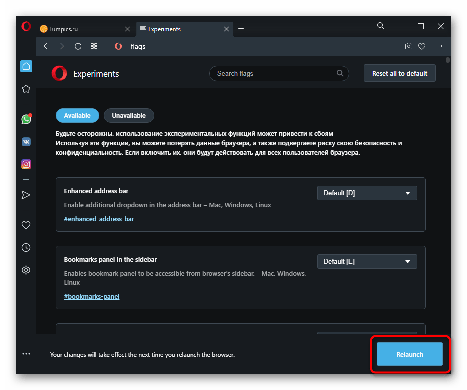 Некоторые пользователи решают более тонко настроить браузер, переходя в раздел с экспериментальными параметрами. Однако бездумный или просто неправильный выбор хотя бы одного значения может привести в лучшем случае к ошибкам и тормозам, а в худшем — к невозможности даже открыть программу. Если вы не так давно заходили в раздел с экспериментальными настройками и что-то там меняли, сбросьте их к состоянию «По умолчанию».
