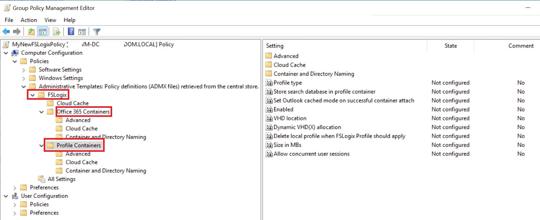 Разверните узел Конфигурация компьютера политики > > административные шаблоны > фслогикс и включите необходимые параметры для конфигурации. в родительской папке фслогикс есть выделенные разделы для облачного кэша, контейнера Office 365 контейнере и контейнера профиля.