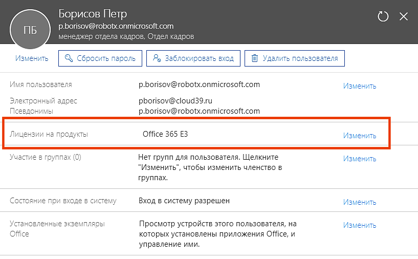 Назначить лицензию или изменить ее можно в профиле пользователя:
