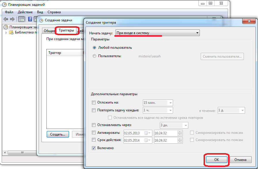 В выпадающем списке Начать задачу выбираем значение При входе в систему и нажимаем ОК.