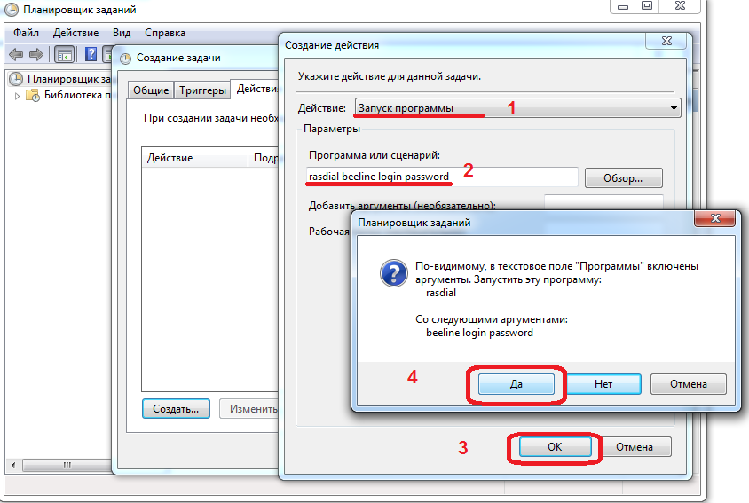 Вводим в поле Программа или сценарий команду:rasdial «имя подключения» login password