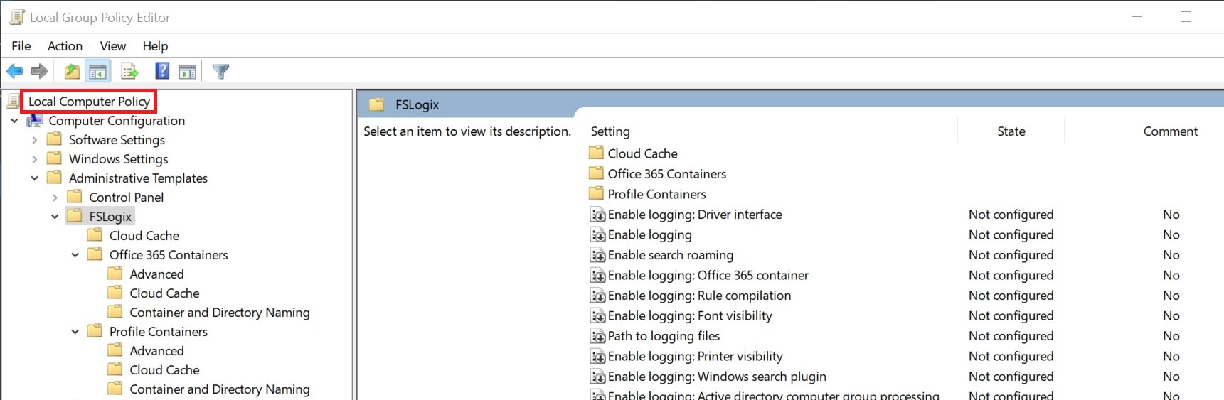 Перейдите к конфигурации компьютера , а затем Административные шаблоны найдите контейнер фслогикс .