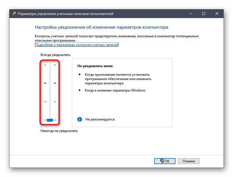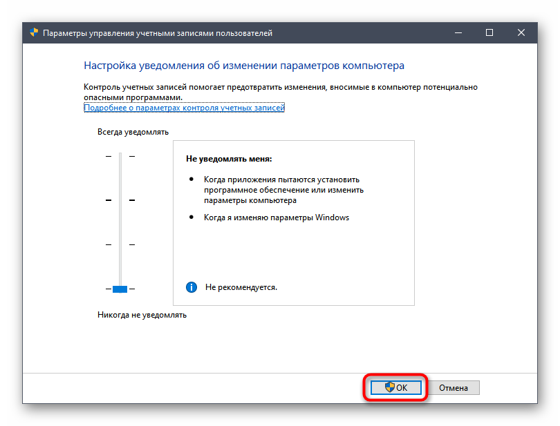 После открытия переместите ползунок в состояние «Никогда не уведомлять».