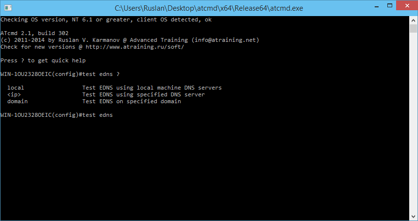 Для упрощения тестирования в ATcmd есть диагностический контекст – test, в котором поддерживается несколько типовых сценариев опроса DNS-серверов на предмет поддержки EDNS0:
