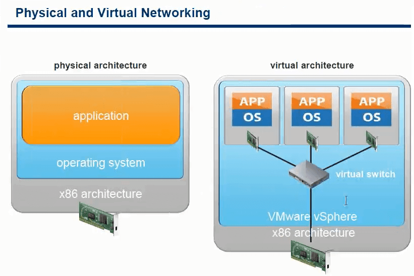 Что касается виртуализации сети, тут дело выглядит следующим образом. Если рассматривать физический сервер, то имея у себя сетевой адаптер, он использует его монопольно, со всей полосой пропускания. Рассматривая virtual архитектуру, то есть виртуальный коммутатор, в который подключенный виртуализованные сетевые адаптеры, а виртуальный коммутатор, общается уже с физическим сетевым адаптером или адаптерами. Вся пропускная способность делится на все виртуальные машины, но можно настроить приоритеты.