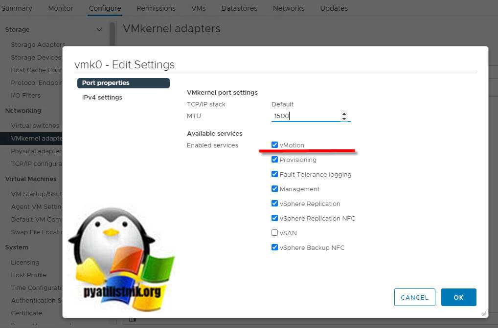 Далее вам остается просто активировать на данном VMkernel нужную галку «vMotion». Так, что если вы до этого не знали, где активируется vMotion в vCenter 7, то вам придется попотеть в поисках данной кнопки.