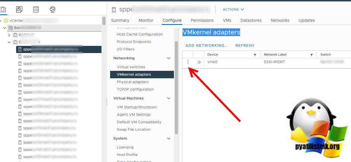 Давайте покажу как активируется vMotion на хостах ESXI 7 через vCenter 7. Откройте HTML клиента и выберите нужный вам хост, перейдите на вкладку «Configure — Networking — VMkernel adapters». У вас тут будет список интерфейсов VMkernel. Слева вы можете увидеть совершенно непримечательную кнопку в виде трех вертикальных точек, нажмите ее.