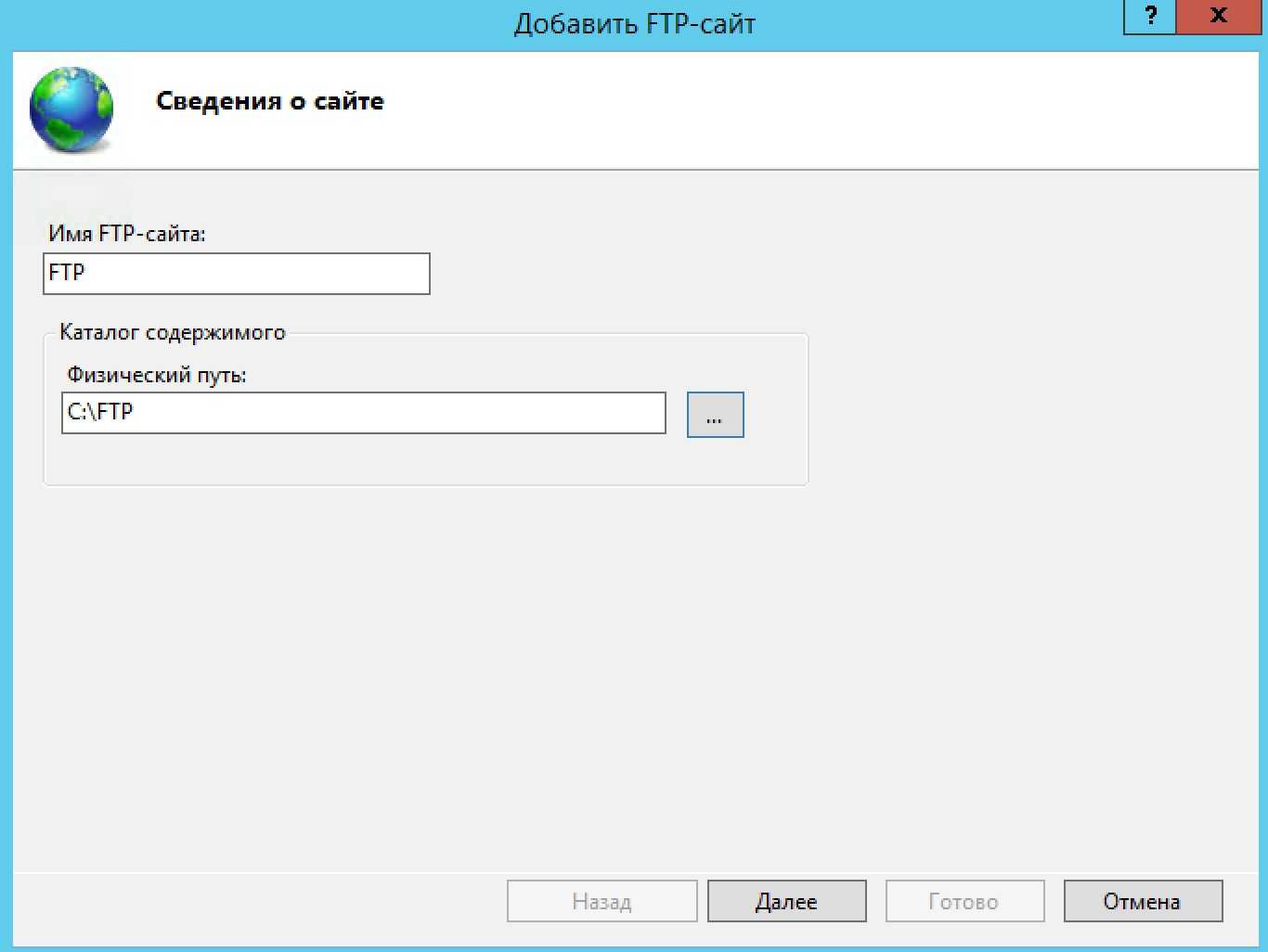 На дальнейшем шаге укажите название FTP-сайта и введите путь до каталога, в котором будут храниться файлы.