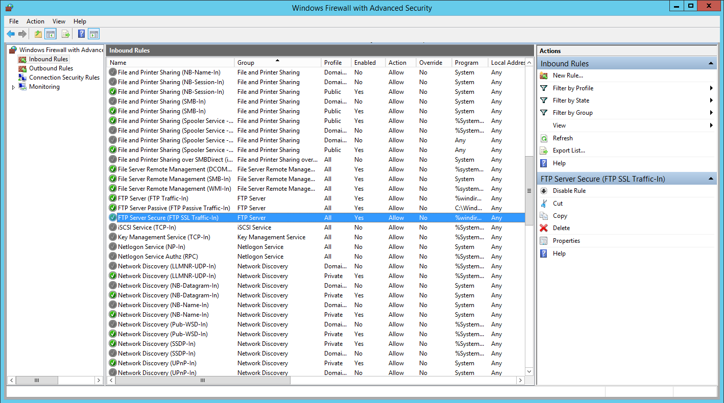 При установке роли FTP сервера в настройках Windows Firewall автоматически активируются все необходимые правила, которые нужна для доступа пользователей к FTP.
