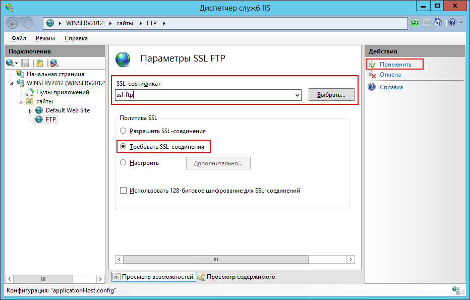 В новом окне выберите политику Требовать SSL-соединения, в выпадающем списке выберите ваш сертификат и нажмите действие Применить.