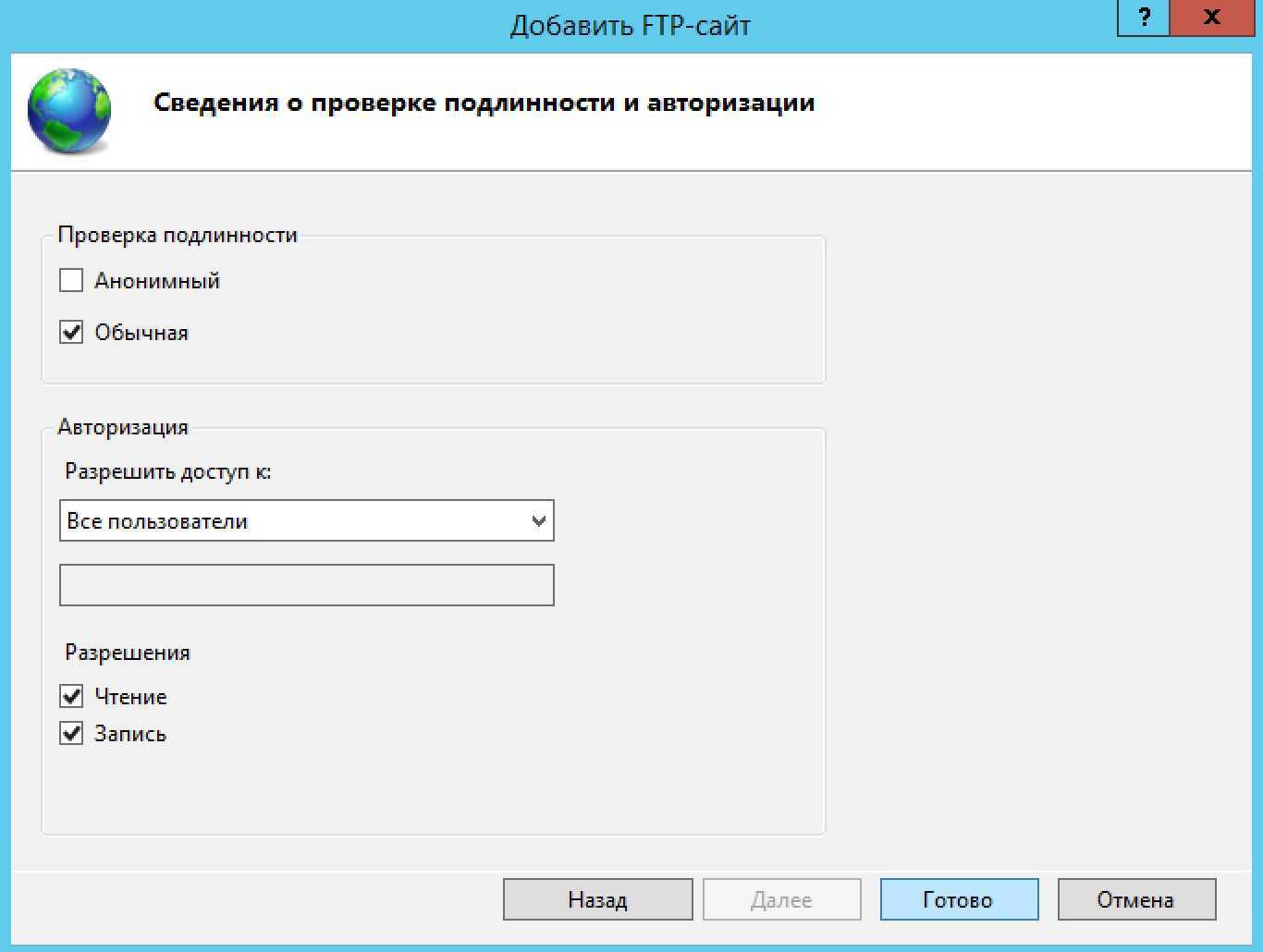 На последующем шаге выберите обычную аутентификацию и разрешите доступ всем пользователям (с разрешениями на чтение и запись).