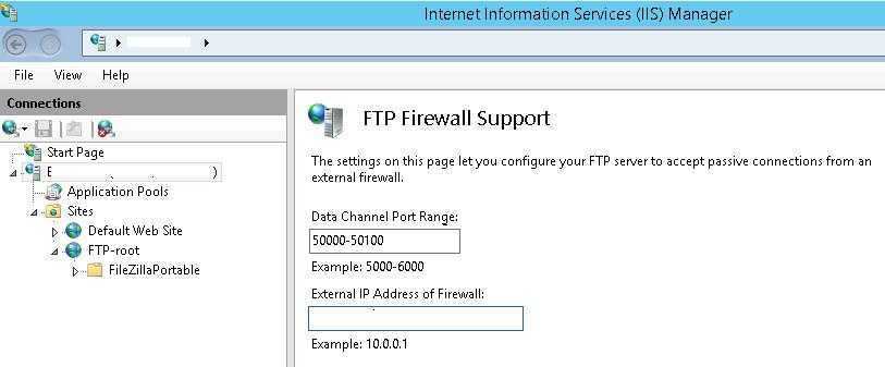 In order not to open the whole range of TCP ports 1024-65535 to an FTPS server from outside, you can specify the range of used addresses for the FTP server. The range is specified in the IIS site settings in FTP Firewall Support section.