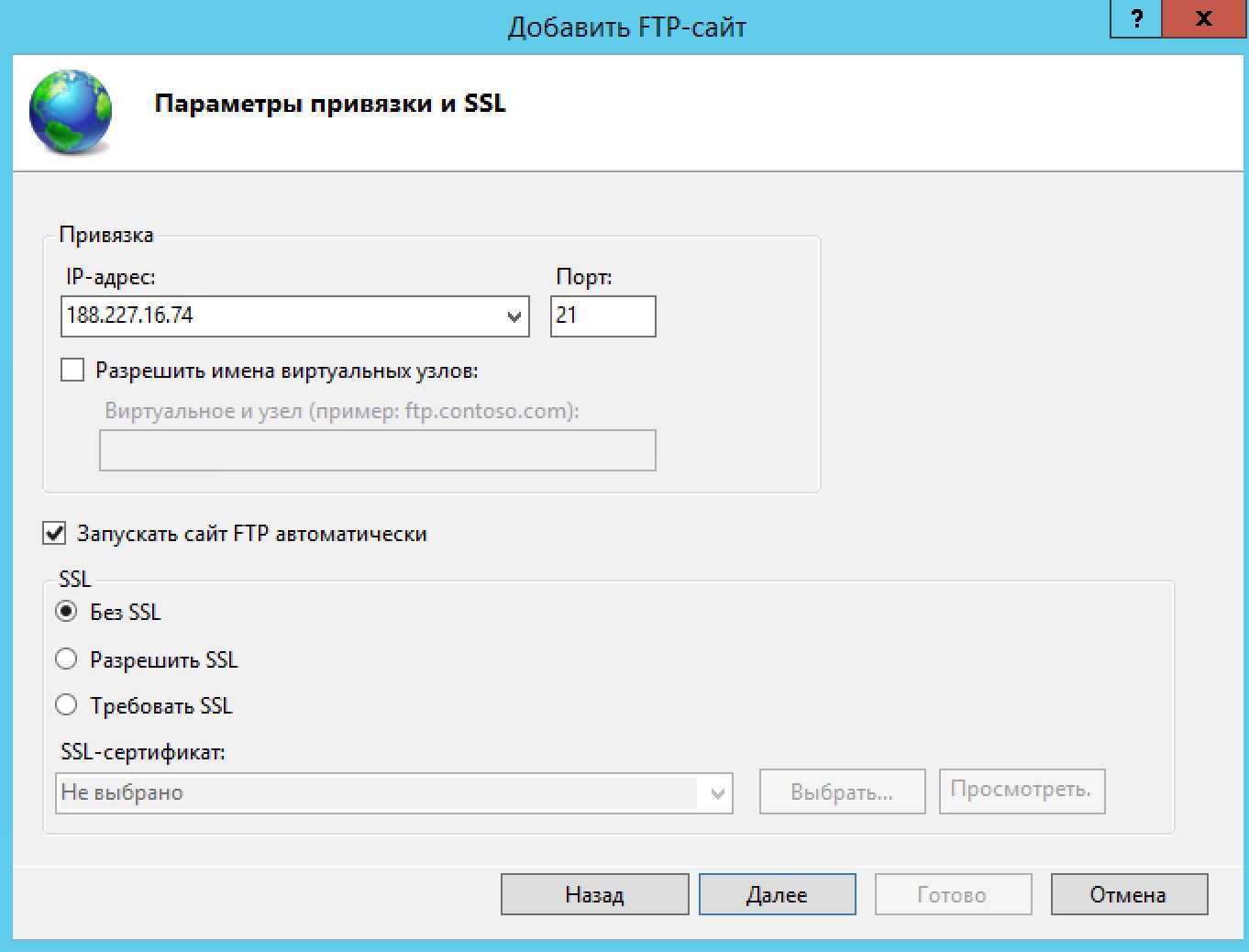 Затем необходимо выбрать IP-адрес сервера (он должен совпадать с адресом, указанным в панели управления сервером), установить галочку напротив «Запускать сайт FTP автоматически» и «Без SSL»: