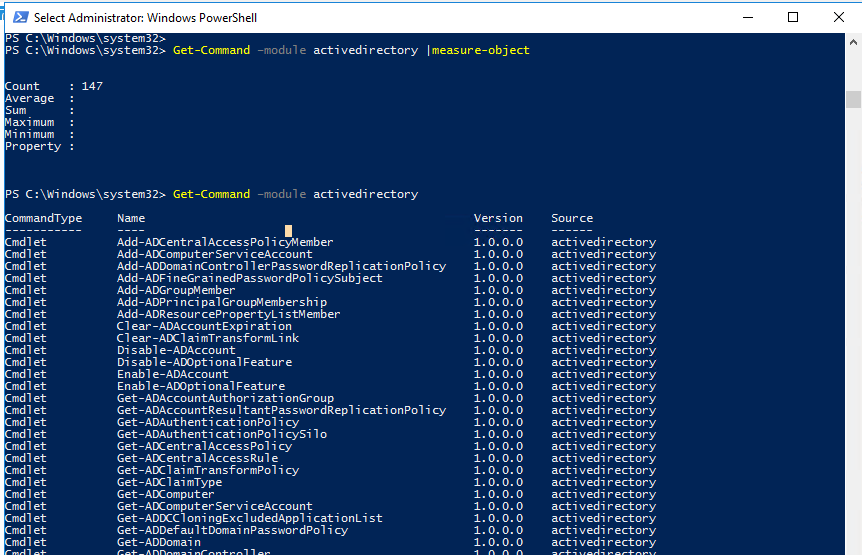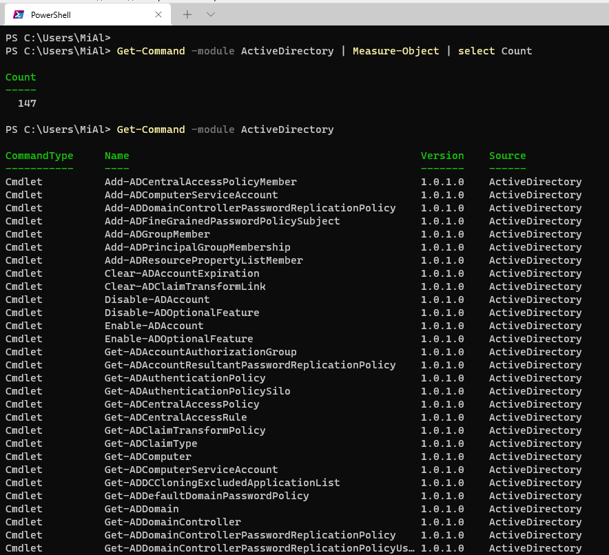 В модуле Active Directory для Windows PowerShell есть множество командлетов для взаимодействия с AD. Каждая новая версия RSAT содержит больше командлетов, чем предыдущая. В Windows Server 2022 доступно 147 командлетов PowerShell для Active Directory.