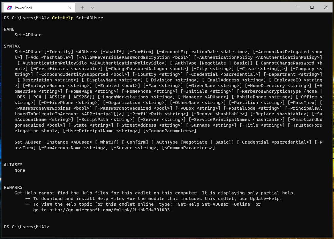 - Командлеты класса Set- служат для изменения параметров объектов в AD, например, вы можете изменить свойства пользователя (Set-ADUser), компьютера (Set-ADComputer), добавить пользователя в группу и т.д. Для выполнения этих операций у вашей учетной записи должны быть права на объекты, которые вы хотите изменить (см. статью Делегирование прав администратора в AD).