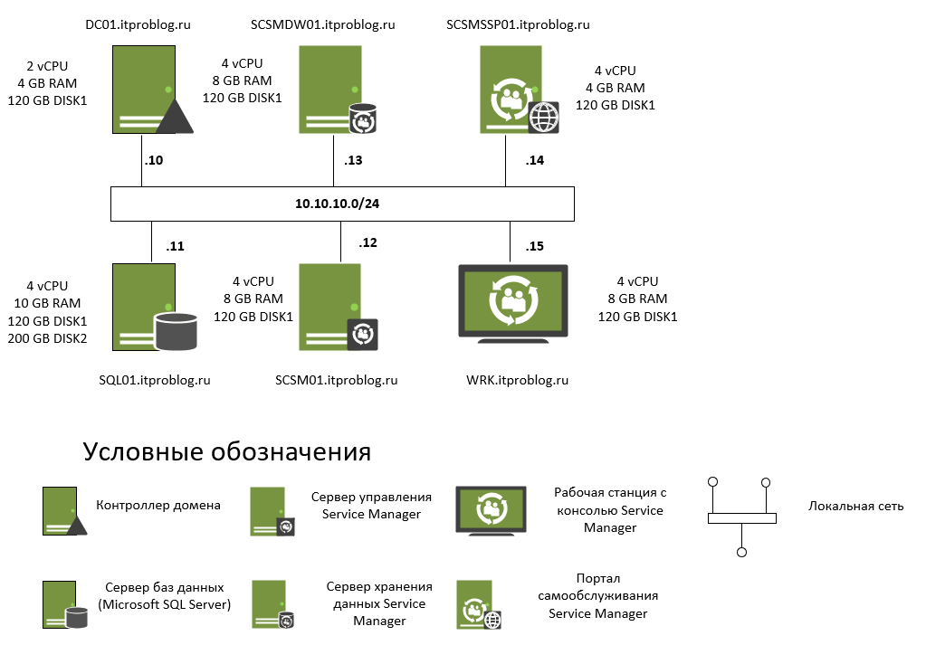 | scsm01.itproblog.ru | Сервер управления | 4 | 8 | Диск 1 – 120 ГБ. | 10.10.10.11/24 |