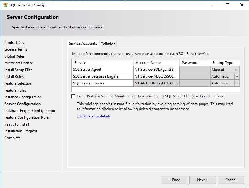 В следующем окне нам предлагают выбрать сервисные аккаунты, это те учетные записи из под которых будут стартовать службы SQL Server Agent, SQL Server Database, SQL Server Browser. По умолчанию используются персонализированные учетные записи.